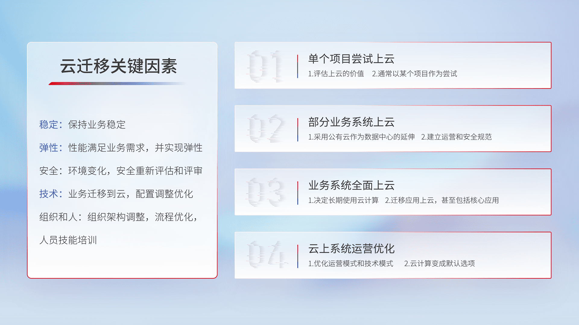 结合实际业务,,从规划设计、、、云平台选型、、云原生改造、、、数据迁移、、、、集成交付,,,迁移全过程为客户识别最佳上云路径,,做好风险识别管理,,,设计网络架构、、身份权限、、、安全审计合规、、、操作审计、、、日志审计、、、监控告警策略、、、多站点容灾设计等,,对云上基础设施进行整体规划,,,提升IT治理水平,,,以满足弹性、、高可用、、高性能的需求。。